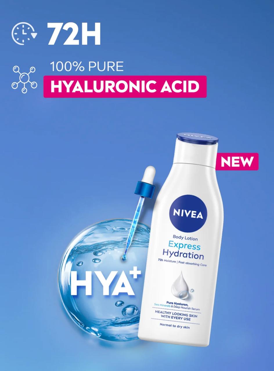 Express Hydration Body Lotion is a fast-absorbing daily moisturizer specially designed to provide up to 72 hours of deep hydration. Enriched with Pure Hyaluron, Sea Minerals, and Deep Nourish Serum, it instantly moisturizes the skin and locks in moisture for long-lasting softness.