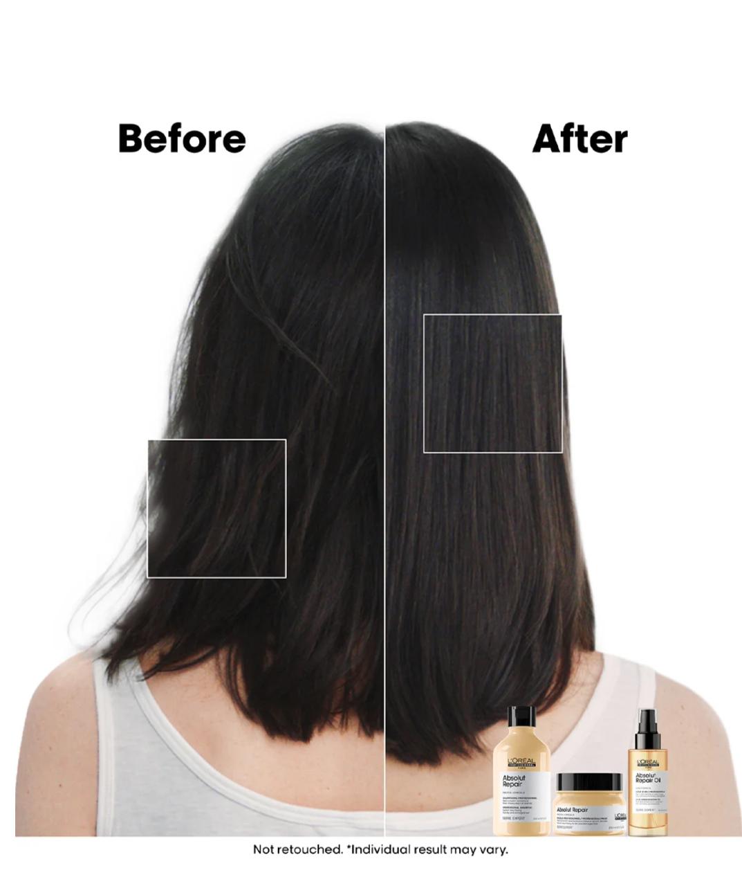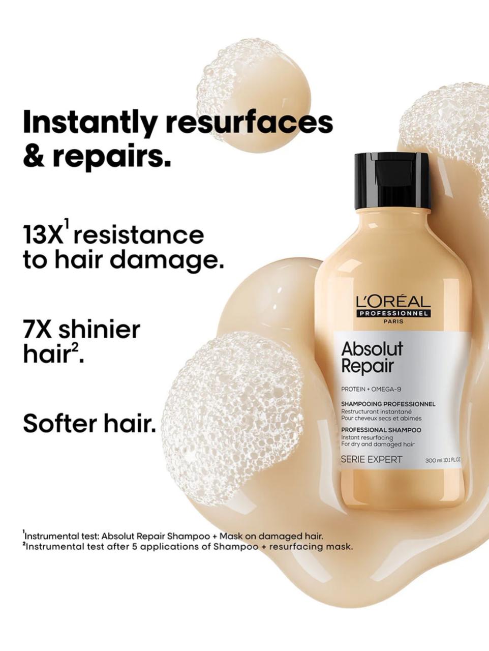L’Oréal Professionnel Absolut Repair Shampoo is a professional repairing shampoo specially designed for dry and damaged hair. Enriched with Protein + Omega-9, this advanced formula deeply cleanses while instantly resurfacing and strengthening hair fibers.
