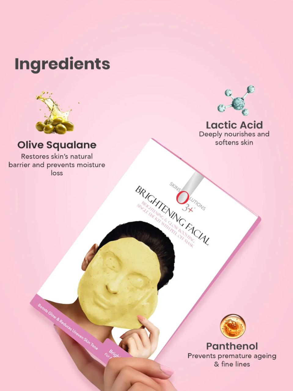 O3+ SkinSolutions Brightening Facial Kit is a salon-grade single-use facial designed to instantly enhance skin brightness and improve uneven skin tone. Enriched with powerful brightening and glow-boosting actives, this peel-off facial kit helps remove dullness, refresh tired skin, and restore a natural healthy glow. The advanced formula works gently yet effectively, making it suitable for all skin types and ideal for quick radiance before special occasions.