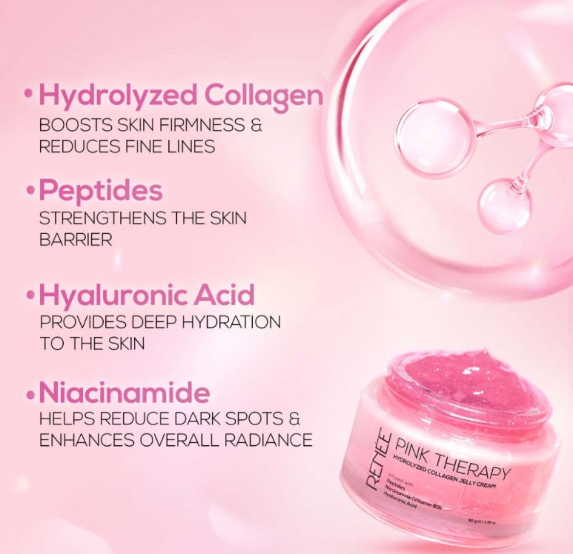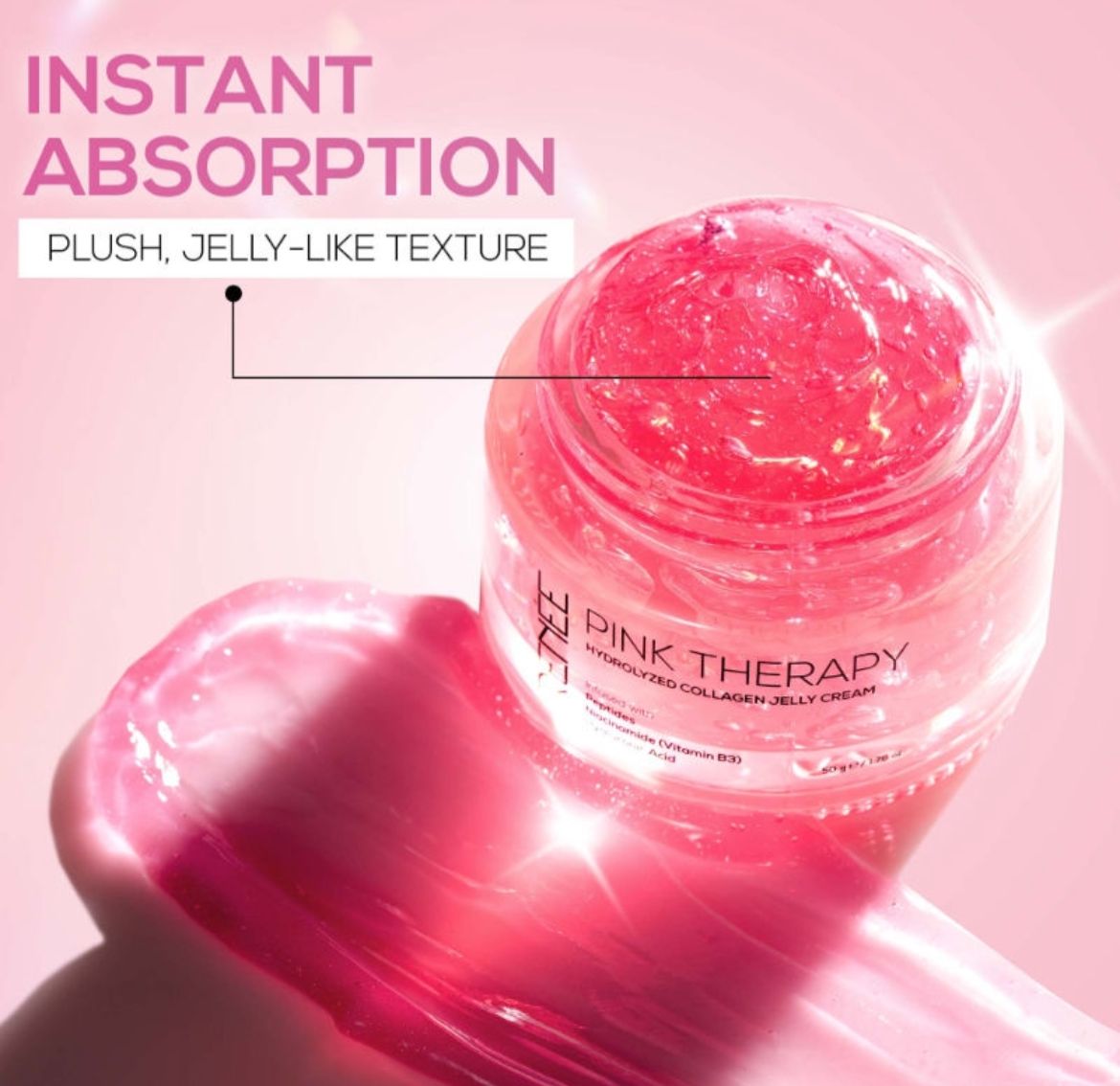 Pink Therapy Freeze Hydrolyzed Collagen Jelly Cream is a lightweight, fast-absorbing moisturizer with a unique jelly-like texture that melts into the skin. Infused with Hydrolyzed Collagen and Niacinamide (Vitamin B3), it helps improve skin elasticity, enhance hydration, and support a smooth, plump appearance. The cooling, non-sticky formula delivers instant freshness while leaving skin soft, radiant, and visibly healthier—perfect for daily use and ideal under makeup.