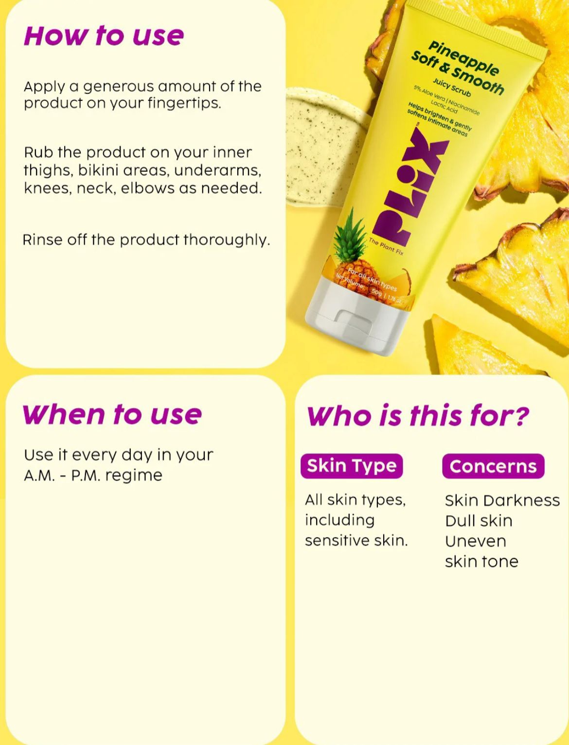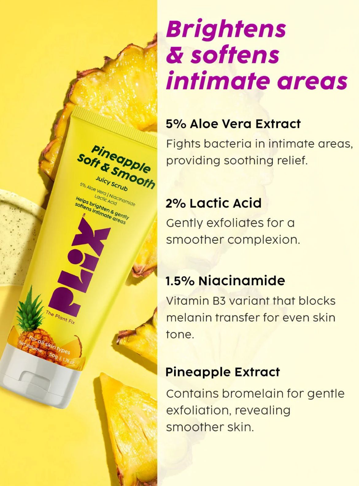 PLIX Pineapple Soft & Smooth Juicy Scrub is a mild yet effective exfoliator designed to gently remove dead skin cells and improve skin texture. Enriched with Pineapple extracts, 5% Aloe Vera, Niacinamide, and Lactic Acid, this scrub helps brighten the skin while maintaining hydration. Its juicy, non-harsh formula softens rough areas and leaves skin feeling smooth, fresh, and visibly healthier with regular use.
